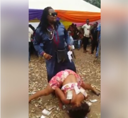 The female dancer twerked more as cash was sprayed on her. People stared in awe as the showoff continued. This happened at a ceremony in the eastern part of the country judging from the music playing in the background.